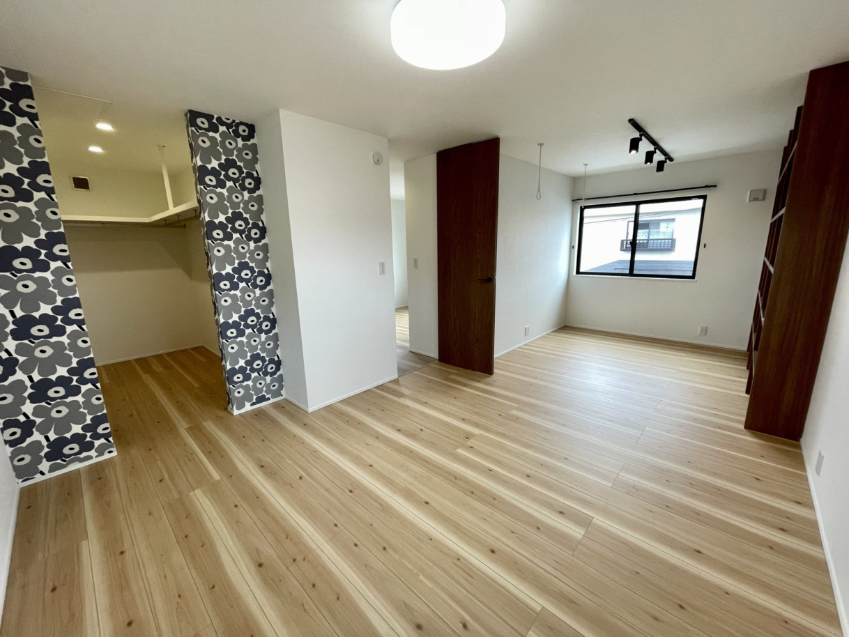 2階の主寝室は、仕切りのない大きな居室とウォークインクローゼット、備え付けの本棚がある開放的で実用性のある作りです。